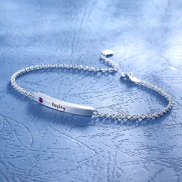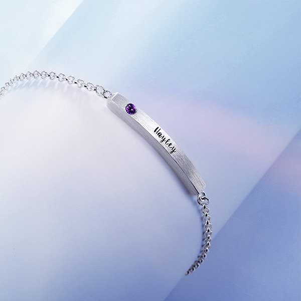 Full av intriger och skönhet, detta armband accentueras av den 4-sidiga, vertikalt dinglande charm. Dess enkelhet utstrålar elegans när det stolt visar ditt namn. Personifiera detta lagerbandsarmband med ditt namn, datum eller initialer och det kommer att graveras precis för dig. Välj mellan sterling silver, guldpläterad eller rosaguld, som visar din utsökta smak i smycken.