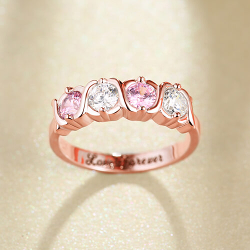 Denna fantastiska ring skymmer med sin mycket speciella födelsesten i en tidlös fyrfaldig sten, designad för att glädja. De fyra sten kramar och kyssar anpassningsbara födelse sten ringen firar de speciella människorna i någons liv. Dessa 925 sterlingsilverband är tillverkade med fyra glänsande zirkonier efter eget val som sitter mellan X: erna i XOXO. Inuti ringbandet kan du välja gravering av specialord på upp till 20 tecken som gör ringen mer meningsfull. Dessa anpassade cz-ringar gör fantastiska gåvor för att representera barn, barnbarn eller nära och kära när du skapar smycken till mamma eller mormor! Du kan också njuta av att tänka på nära och kära varje gång du bär ditt skräddarsydda familjeband. Ge någon en kram och kyss som varar livet när du ger dem denna unika och extraordinära personliga gåva.