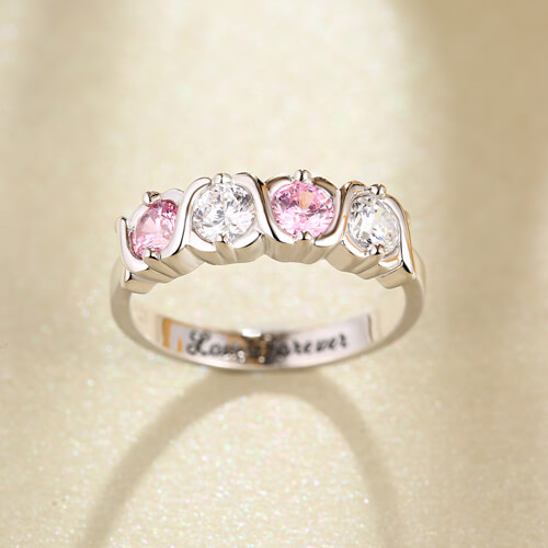 Denna fantastiska ring skymmer med sin mycket speciella födelsesten i en tidlös fyrfaldig sten, designad för att glädja. De fyra sten kramar och kyssar anpassningsbara födelse sten ringen firar de speciella människorna i någons liv. Dessa 925 sterlingsilverband är tillverkade med fyra glänsande zirkonier efter eget val som sitter mellan X: erna i XOXO. Inuti ringbandet kan du välja gravering av specialord på upp till 20 tecken som gör ringen mer meningsfull. Dessa anpassade cz-ringar gör fantastiska gåvor för att representera barn, barnbarn eller nära och kära när du skapar smycken till mamma eller mormor! Du kan också njuta av att tänka på nära och kära varje gång du bär ditt skräddarsydda familjeband. Ge någon en kram och kyss som varar livet när du ger dem denna unika och extraordinära personliga gåva.