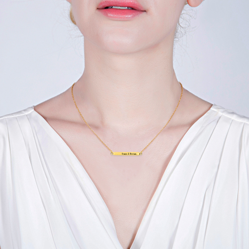 Detta fantastiska halsband med en borstad stånghänge. Varje hänge kan ha upp till 16 tecken graverade på fyra sidor. Du kan välja exakt vad du vill ha på varje sida, skapa en meningsfull memento. Det är en perfekt gåva för att markera förhållandet mellan två bästa vänner, ett kärleksfullt par eller till och med en mor och barn.