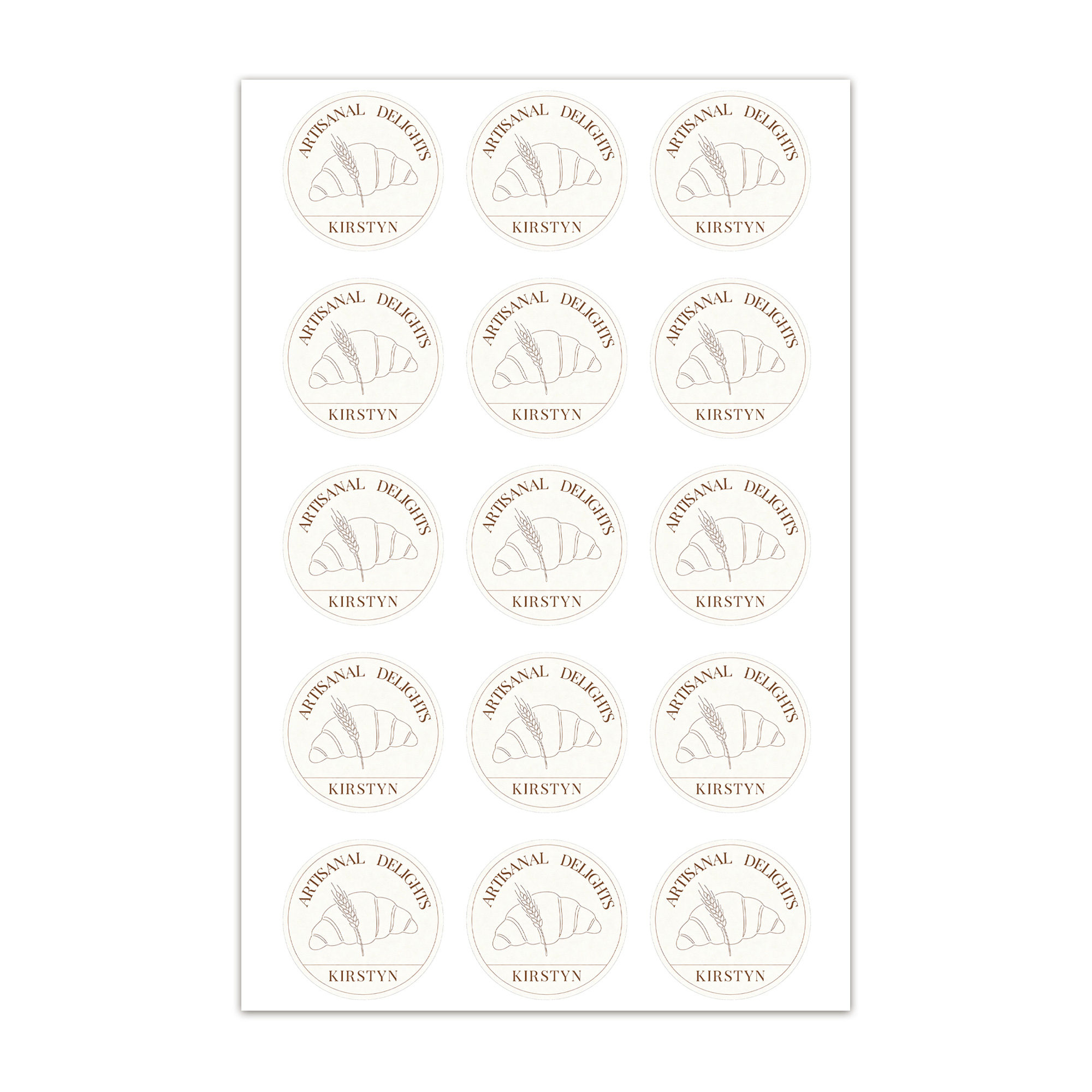 Baktemadesign – Dessa klistermärken lyfter fram klassiska bakelement som croissanter, vetestjälkar och blandningsskålar, illustrerade i en blandning av handritade och rena grafiska stilar med varma, texturerade toner. Varje design har plats för ett anpassat namn eller en butiksetikett, vilket förvandlar varje klistermärke till ett igenkännbart märke som ger en handgjord känsla och stärker förpackningens identitet.