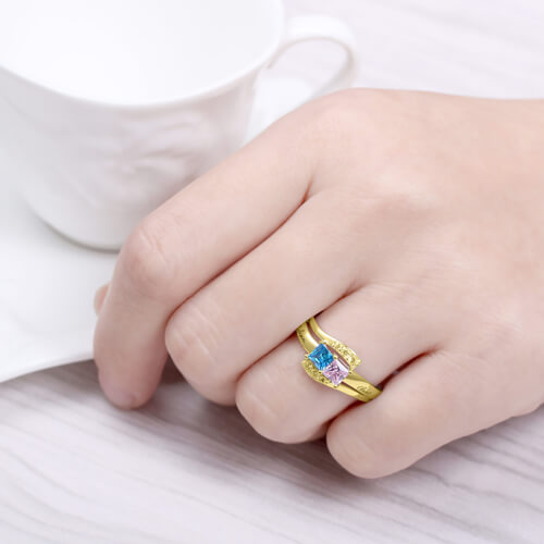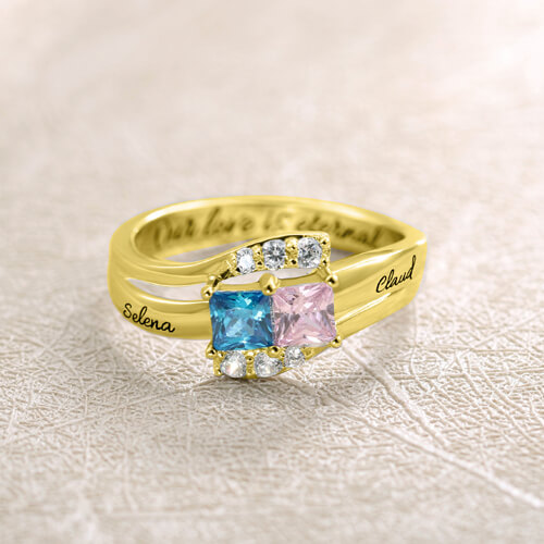 Det krävs två speciella människor för att skapa ett band som lovar lycka för alltid och alltid. Bär nu ett bländande uttryck för hur underbart det är att ha någon som får dig att känna det här med Love's Promise ring. Skräddarsydd med 2 kristallfödelsestenar och 2 graverade namn, denna 2 stenfödelse stenring är en vacker symbol för evighetens kärlek mellan dig och din betydande annan. Bär påminnelsen om ditt band med dig alltid med dubbla kubiska zirkoniska fyrkantiga stenar vardera för att representera dina olika födelsemånader. Graverade på båda sidor av kristallerna är dina namn eller något speciellt ord upp till 8 tecken. Välj födelsestensfärgen du väljer och vi placerar dem i denna vackra miljö. De anpassade zirkonierna är gjorda av massivt 925 sterlingsilver och gör en vacker gåva som hon kommer att värda för alltid. Gravera insidan av dessa band med ett speciellt datum, namn eller ett speciellt meddelande för en personlig touch. Dessa anpassningsbara ringar gör en oförglömlig födelsedag, mors dag eller bara för att gåva. Kvinnors storlek 6 till 12 tillgängliga. Beställ nu!