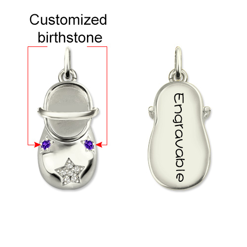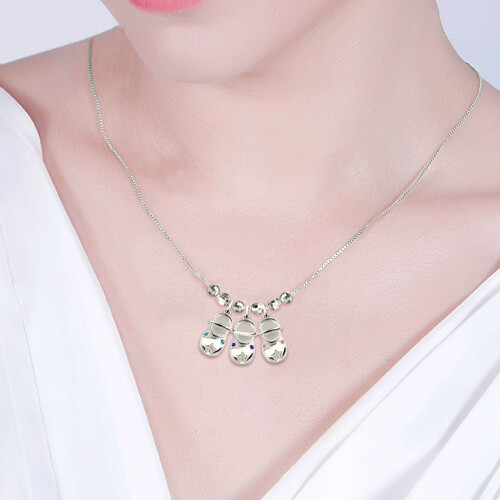 Oavsett om det är nyfött eller alla vuxna, kommer hennes barn alltid att vara hennes bebisar. Vårt bedårande babyskohalsband firar denna känsla med varje barns namn som delikat graveras på botten av babysko och framgraverad födelsesten. en vänlig present till mamma eller mormor, varje sko representerar ett barn.