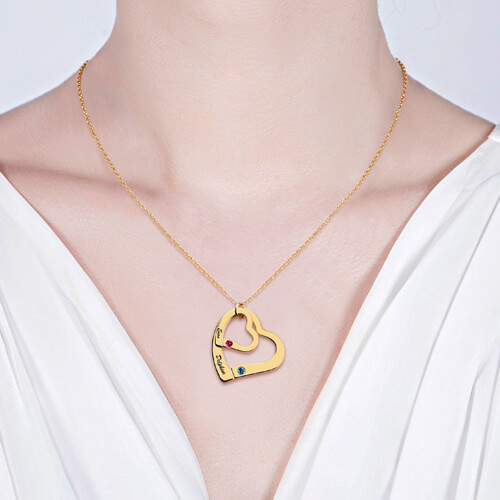 Lägg till en minimalistisk touch av kärlek till ditt utseende! Engraved Double Hearts Necklace with månadssten on the hänge.Two hjärta betyder älskare, familjer eller släktingar.Gravera anpassade namn på hjärtat, du bär det precis som de har varit på din sida. Detta guld dubbel hjärta födelsesten halsband är det bästa valet för älskare.