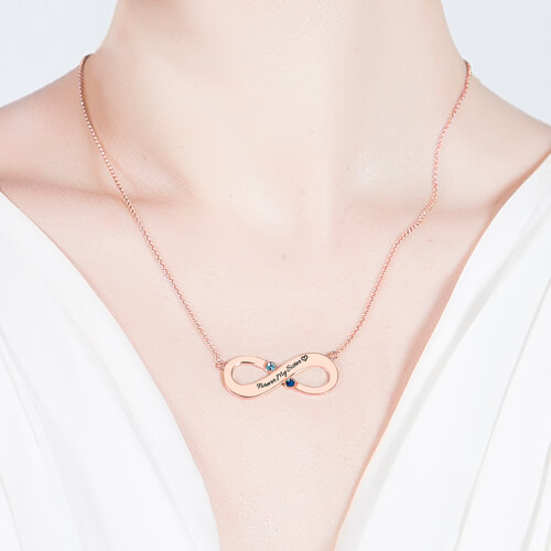 Att visa upp din oändliga kärlek till någon annan blev bara lättare och så mycket vackrare med parets oändliga halsband med födelsetstenar. På grundval av trenden med oändlighetssmycken har vi tagit infinity-halsbandet och gjort det ännu mer speciellt genom att lägga till möjligheten att gravera två namn och välja två födelsestenar. Detta vackra graverade infinity halsband gör en perfekt present till födelsedagar, årsdagar eller något annat speciellt tillfälle!