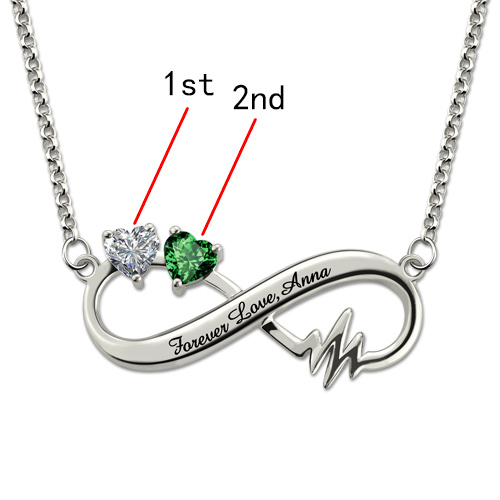 Detta Heartbeat Infinity månadssten -halsband med två födelsestenar står för evigt kärlek mellan dig och hjärtslag ett. Uttryck dina verkliga känslor och avsikter med detta vackra hänge!