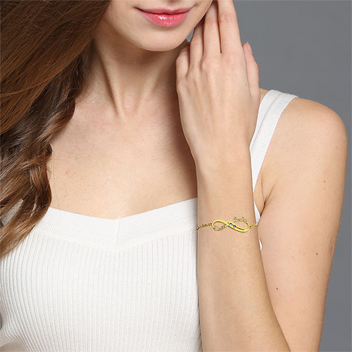 Oändlighetssymbolen kan betyda evig kärlek och vänskap och nu kan du anpassa oändligheten med det dubbla hjärtarmbandet med födelsetstenar. Anpassa detta armband med två namn och två födelsestenar för att visa vem din för alltid kärlek är.