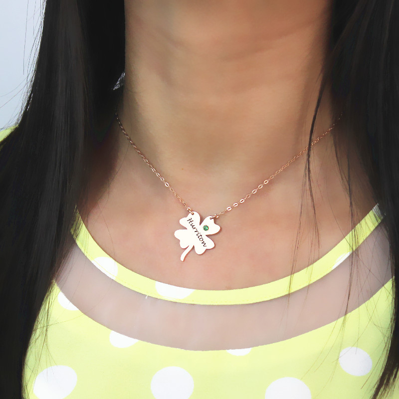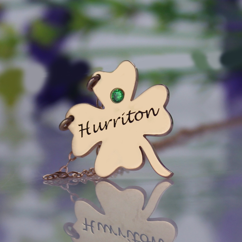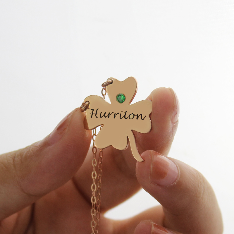 Irish Four Leaf Clover Good Luck Necklace Gaver Rose Gold - Lucky Four leaf leaf clover halsband kommer att få lyckan med Irish med dig! 18ct Rose Guldpläterad på silvergraverad fyrklöver namn hänge är det bästa valet av irländska julklappar till din familj eller vänner. En bästa vän är som en fyrklöver: svårt att hitta och tur att ha. Så du kan inte missa detta klöverhalsband.