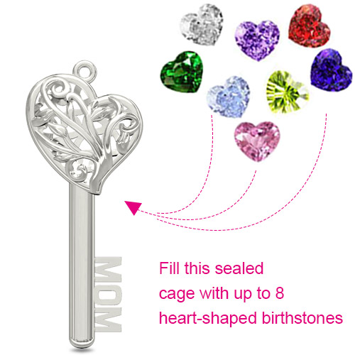MAM Heart Cage Key Necklace tillåter 1-8 födelsesten i släktträddesignen i bur, kan representera en familj träffas och familjer djupa kärlek. Det är en utmärkt present till mamma. Nyckelformen kan symbolisera öppet någons hjärta och kan också användas för att ge en person du gillar.