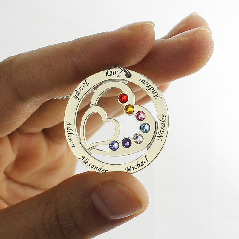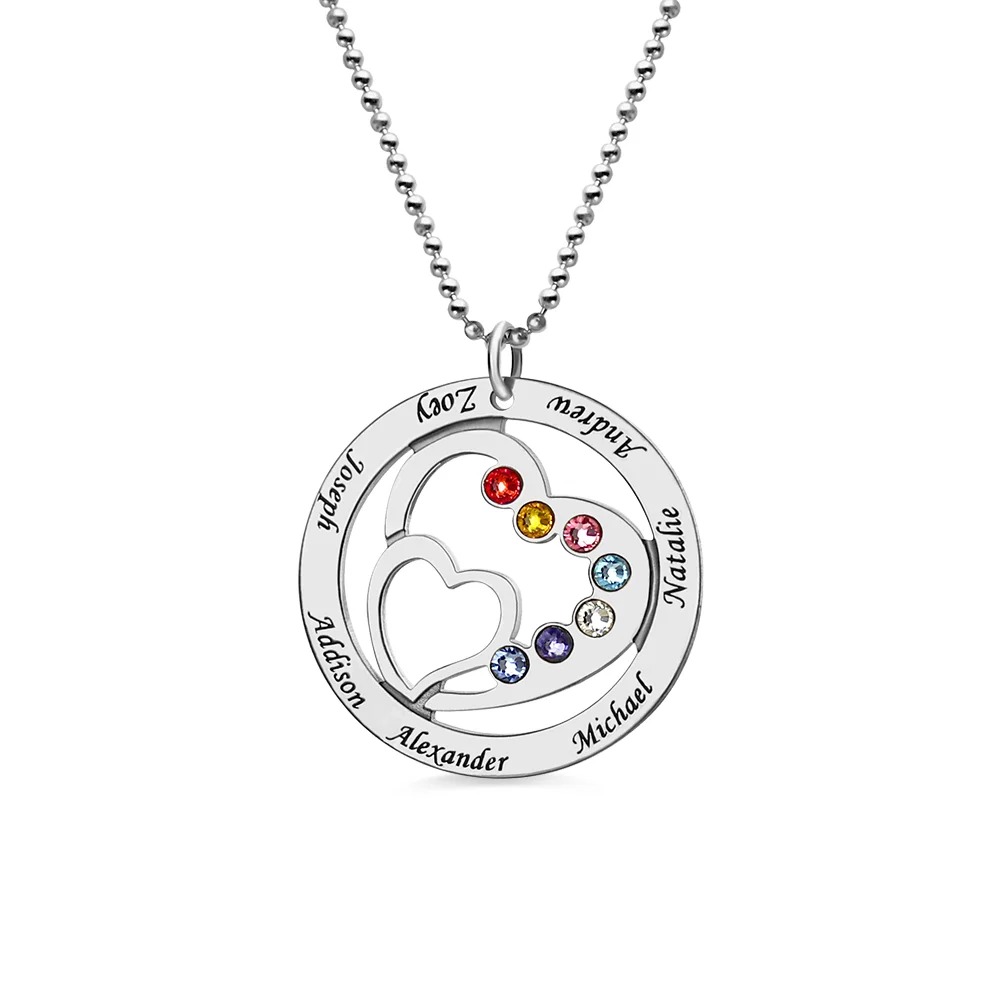 Moms Gift - Heart in Heart månadssten Necklace with kids Namn - En mamma håller alltid sina barn nära sitt hjärta i hjärtat, var och en är en vårdad familjemedlem. Nu, speciellt skapad för en kärleksfull mamma, fångar detta personliga hänge familjens kärlek i ett vackert uttryck.