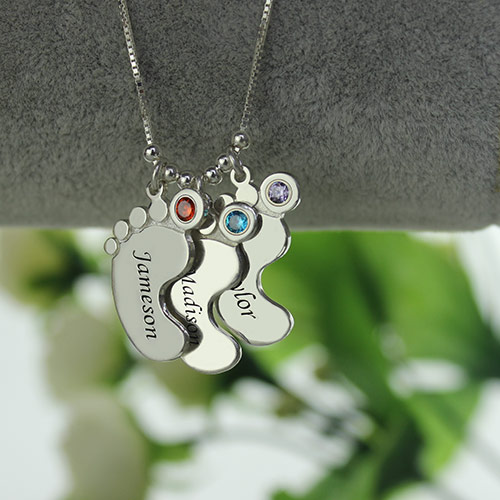 Mamma älskar allt som firar sina barn, för att inte tala om detta vackra Baby Feet Necklace av högsta kvalitet, tänkt att hålla livet ut. Gravera upp till fem babyfotcharm med barnens namn eller datum och födelsesten på varje hänge. Fira födelsens mirakel med detta minneshalsband. Det är en fantastisk present till mamma när som helst på året som födelsedagar, mors dag eller jul. Varje mamma kommer säkert att älska och uppskatta detta halsband för ny mamma. Detta förtjusande lilla charmhalsband är av högsta kvalitet, tänkt att hålla livet ut.