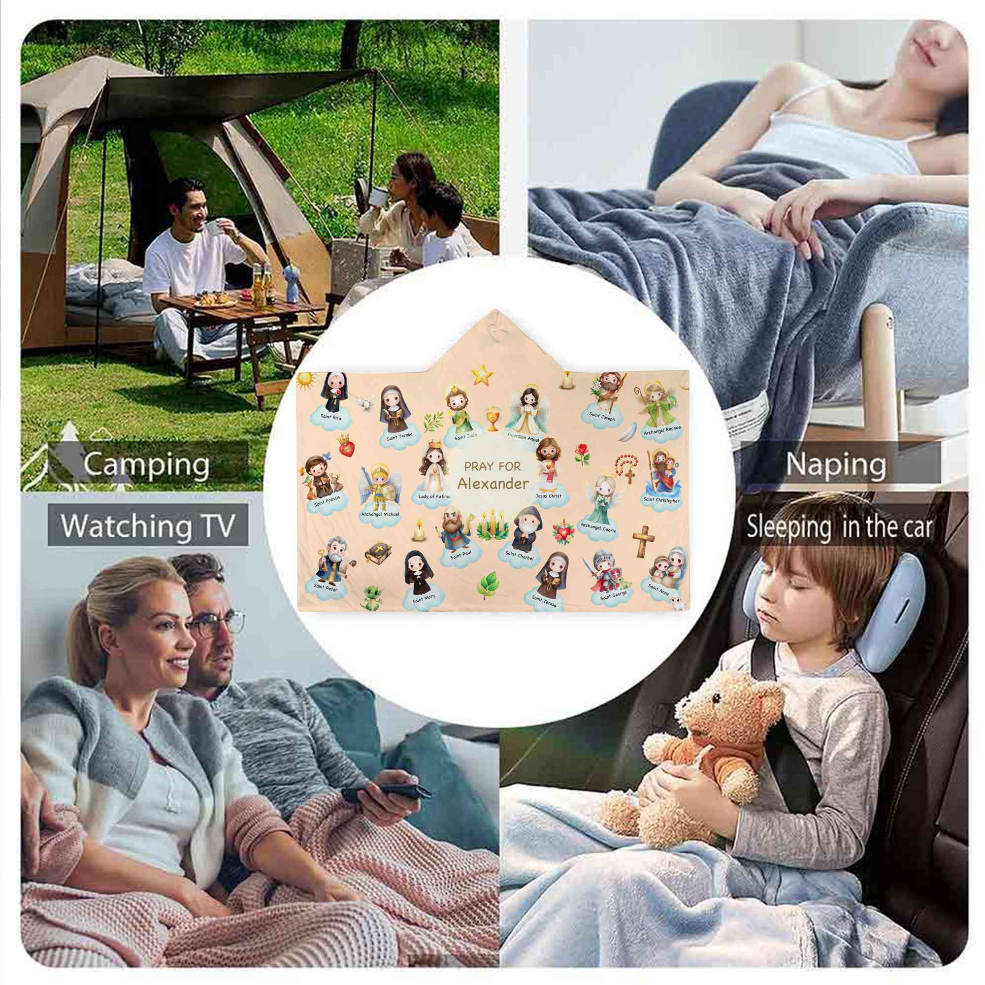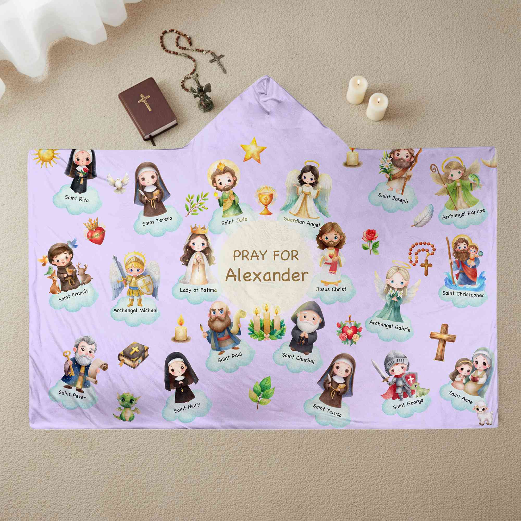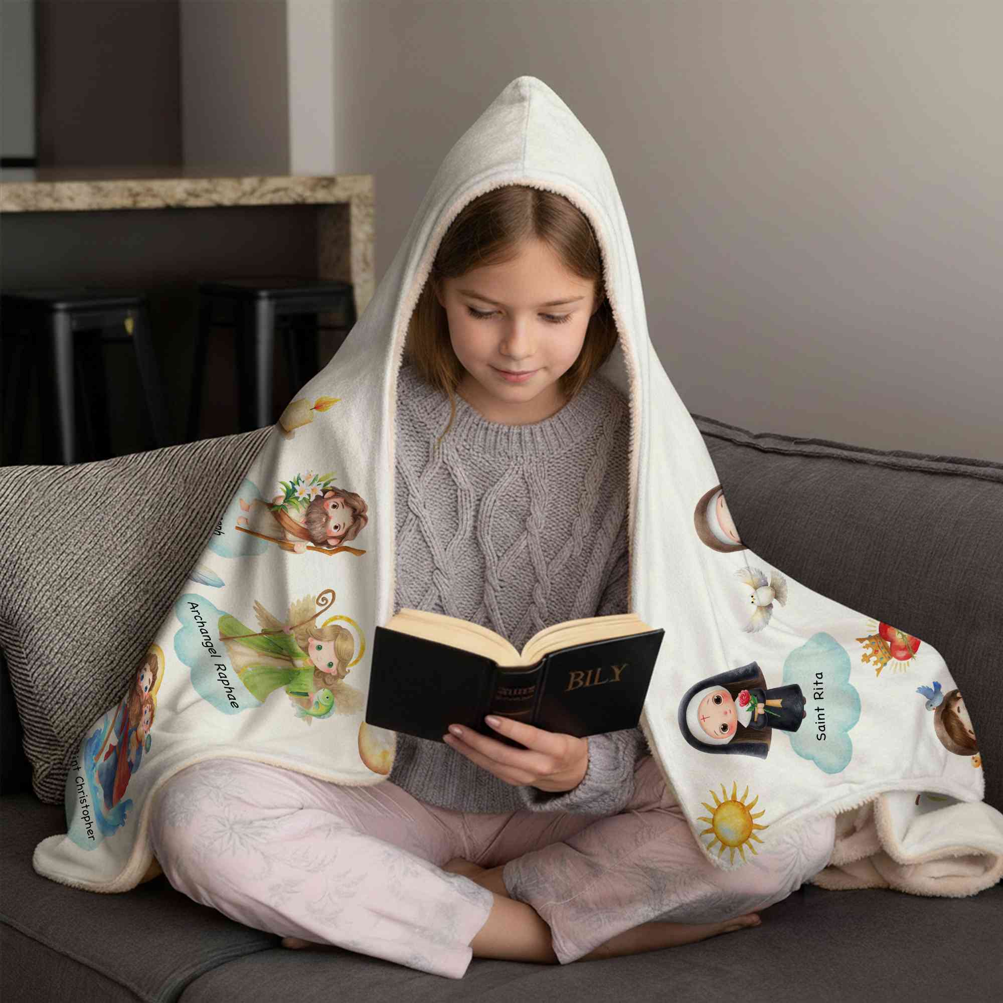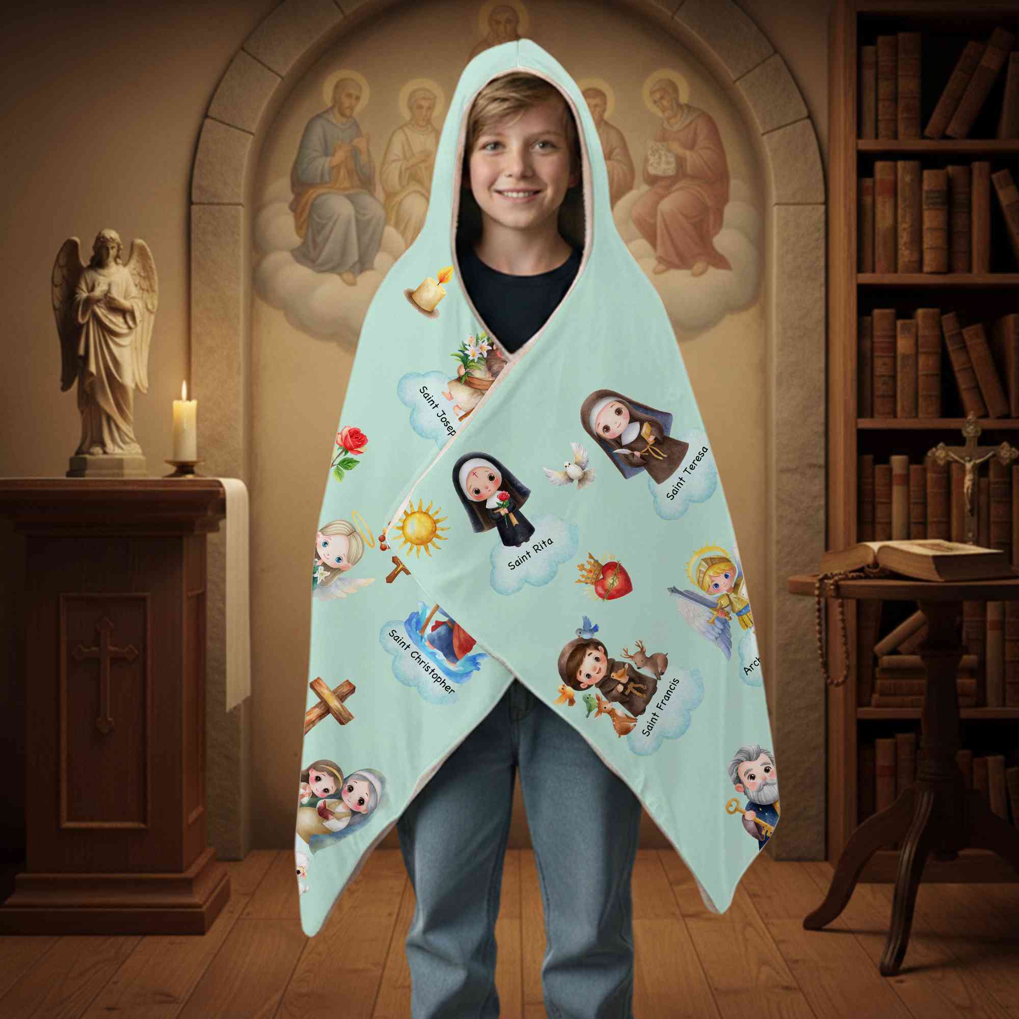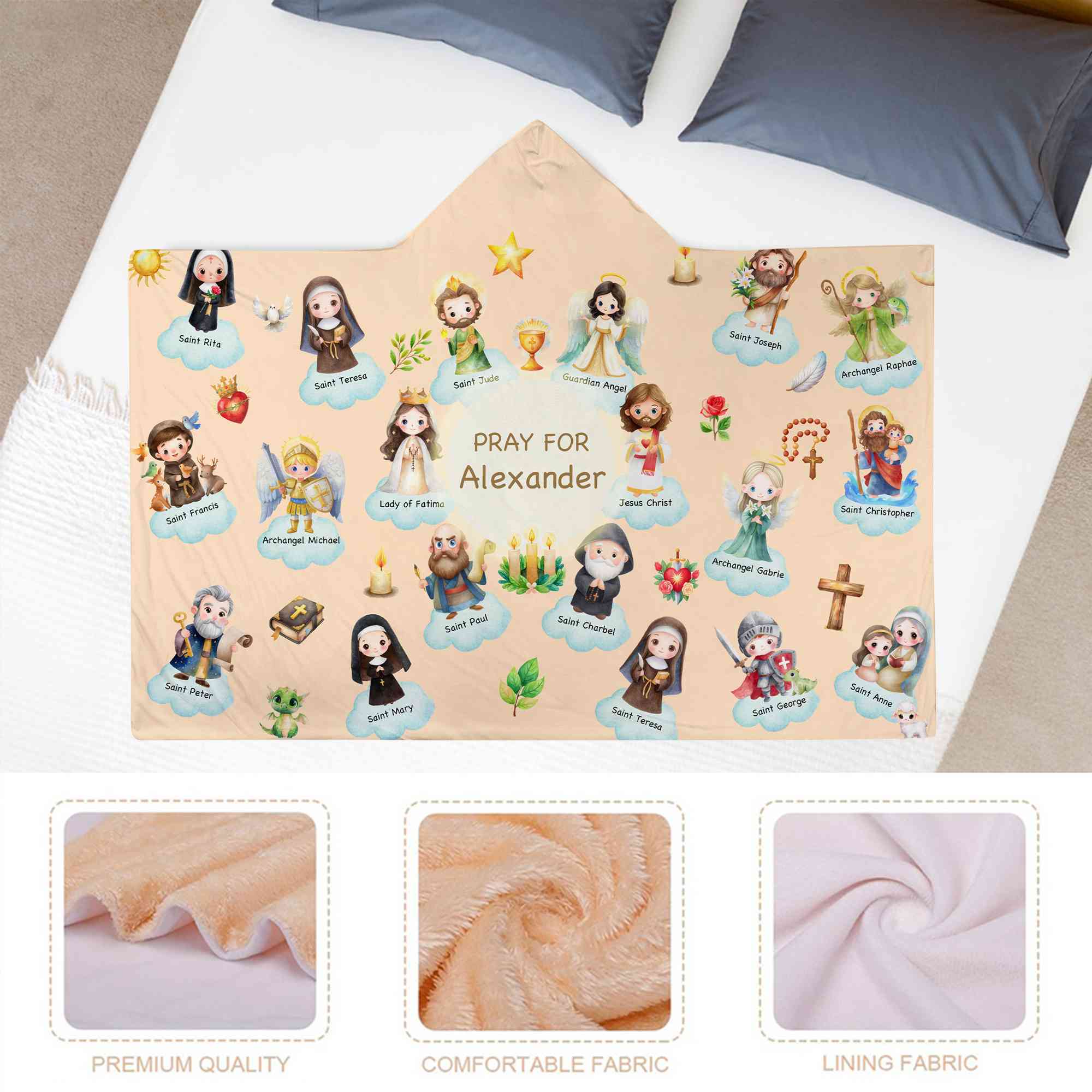 Trosinspirerad tecknad design - Denna filt med huva har charmiga tecknade helgon från himlen, vilket ger ett milt och glädjefyllt uttryck för tro. Den lekfulla stilen tilltalar barn samtidigt som den återspeglar kristna och katolska värderingar på ett varmt och tröstande sätt.