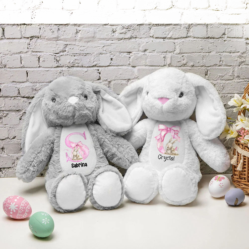 Bedårande kanindocka - den personliga rosa rosetten initiala kanindockans leksak har en charmig kanin med rosa rosettdesign. Den här söta och gosiga plyschleksaken är perfekt för de små och ger en touch av infall i alla rum.