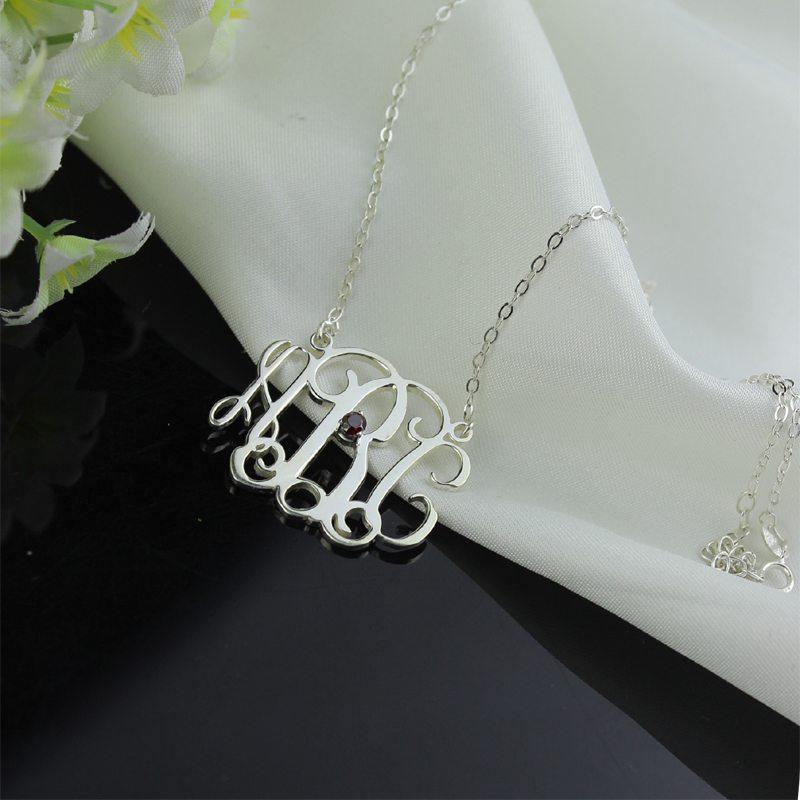 Personaliserat sterling silver monogram halsband med en födelse sten