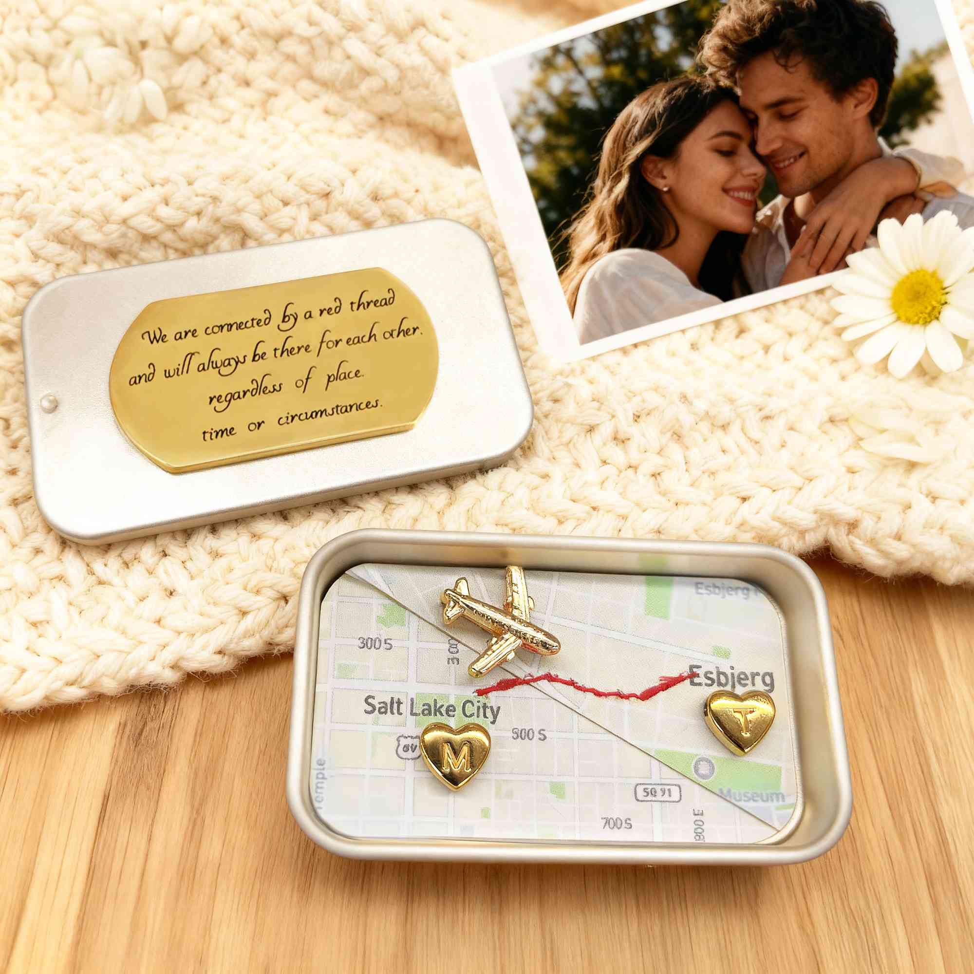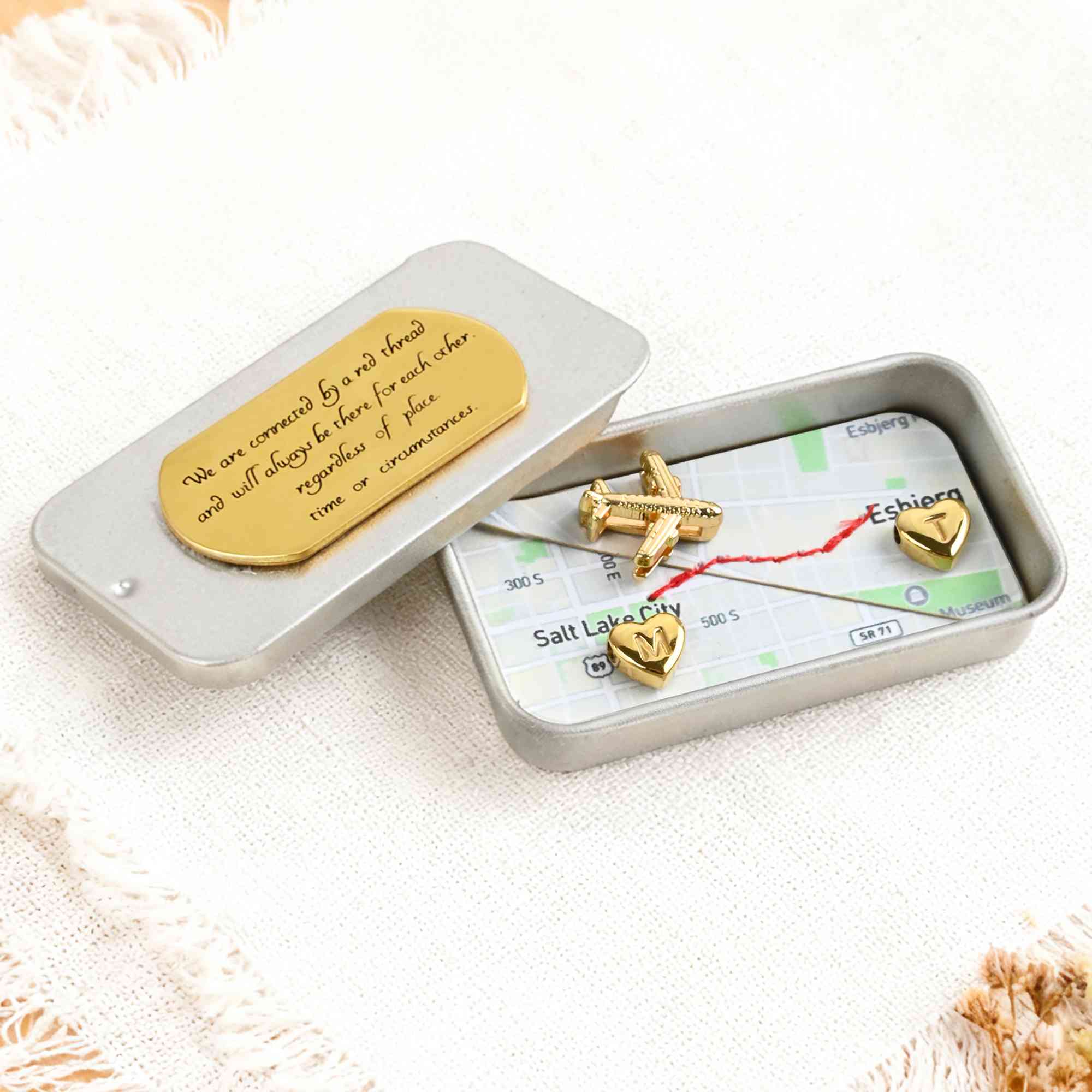 Anpassad design - Denna unika present består av två valfria kartor i en charmig liten plåtask, vilket gör den till ett perfekt minne för vänskap eller långdistansrelationer. Personifiera två små mässingshjärtan med initialer och lägg till ett sentimentalt element som förstärker den övergripande designen.