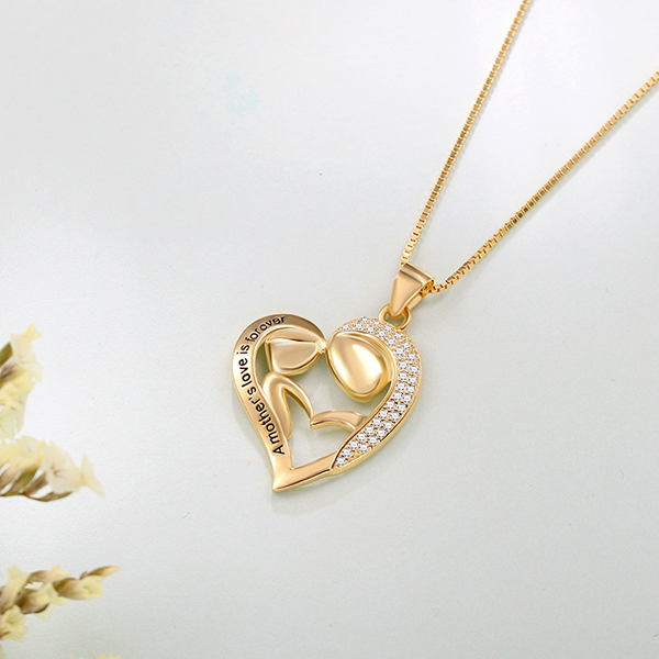Den här hänge-uppsättningen för mamma och dotter är den perfekta familjens halsband som du kan dela med en mamma och hennes barn. Detta sterling silver mor dotter halsband har två olika delar. Den vänstra delen är en form av barn och graverade också ett kärleksfullt meddelande om "En mammas kärlek är för evigt" på vänster hjärta som tar mammas andedräkt. Den rätta delen är formen av mamma och även fulla stenar i det högra hjärtat som uttrycker oändlig kärlek till mamma. Mor- och dotterhalsband blir populärt, och denna sterling silverversion kommer att bli en favorit hos dig över natten. Orden påminner henne om att du tänker på henne alltid och hedrar allt hon betyder för dig att det är en speciell gåva hon kommer att behålla för alltid.