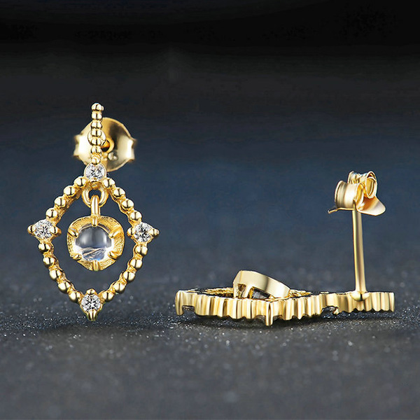 Den moderna designen har en naturlig blå månsten, som är omgiven av totalt 4 äkta kubisk zirkonit. Dessa naturliga månstone örhängen var handgjorda i 925 sterling silver. Denna naturliga månsten smycken design är designad med två ädelstenar av naturlig blå månsten. Den blå månstenen är bra för människors sinne, och dess vackra utseende kan göra dig eller någon du älskade mer underbara och eleganta. Det är en riktigt lämplig present till födelsedag, årsdag och andra meningsfulla dagar.