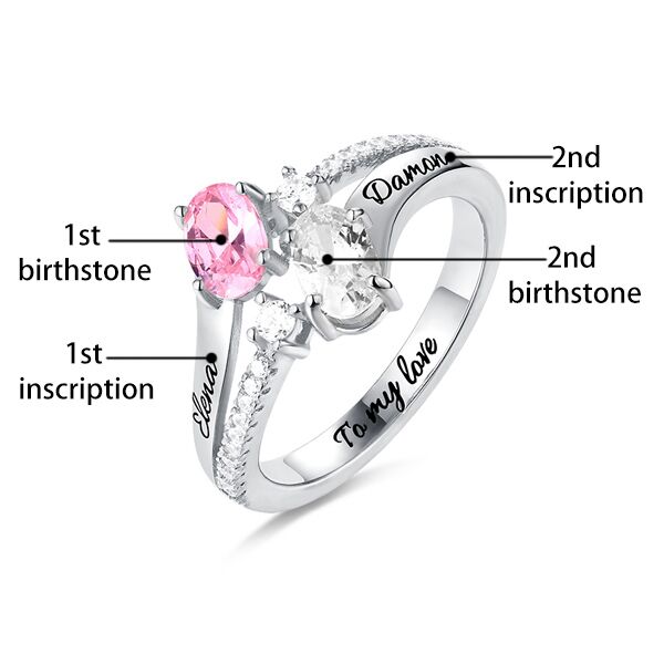 Elegant handgjorda från 925 sterlingsilver i en fantastisk design. Denna romantiska ring har de två ovala födelsestenarna som mittpunkten, accentuerade med två klara födelsestenar för extra glittring. Dessutom kan du välja att gravera några specialkaraktärer på innerbandet och på båda sidorna av födelsestenarna, vilket skulle göra ringen mer unik. Denna utsökta personliga kvinnorring är en verkligt underbar gåva!