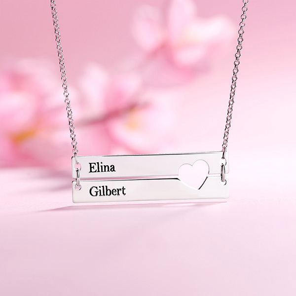 Med en utskuren hjärtadetalj som kompletterar de två eleganta, graverbara barhalsbanden ger en touch av romantik till varje outfit. Det är det perfekta sättet att representera dina betydande andra, eller vänner och familj! Komplett ditt one-of-a-kind halsband i ditt val av sterling silver, guld eller rosaguld. Den perfekta gåvan för ditt livs kärlek för att anpassa den anpassade graveringen.