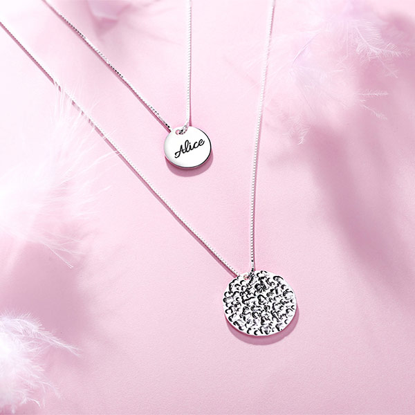 Trenden med myntkultur har berikat mycket kul till i sommar. Det är enkelt och snyggt. Design med olika längder, storlekar och former, bär dem tillsammans för att skapa ett mer lager och snyggt utseende. Du kan gravera namnet på det lilla sterling silver skivhalsbandet som kommer att öka minnesbetydelsen och den stora cirkeln gör den handgjorda strukturen, som ger mynthalsbandet mycket retro smak. Kommer att matcha alla kläder och utseende du vill ha.