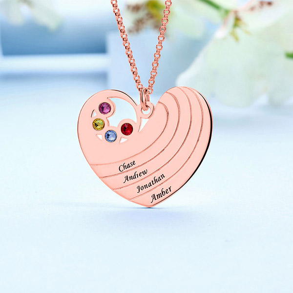 Det finns så många hjärthalsband att välja mellan! Vår moderhalshalsband med födelsetstenar erbjuder några unika detaljer, tillsammans med en vacker, modern profil som skiljer det från många andra stilar. Du kan göra denna ring personlig med ditt val av 4 födelsestenar och 4 namn. Detta vackra mödrar födelsesten halsband finns också i ditt val av guldplatta eller sterling silver.