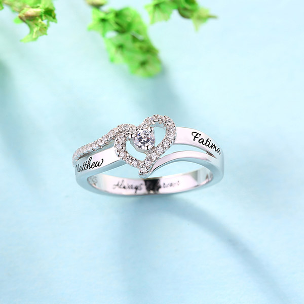Denna klassiska Heart Shape CZ-ring är en underbar symbol för skönhet och glädje. Konstruktionen har hjärtaform som omger kubiska zirkoner och det finns en rund vit kubik zirkon som ska placeras i hjärtat mitt. Gravera eventuellt ett speciellt meddelande på bandet. Det är så skimrande och elegant att enkelt kan matcha med alla typer av dina klädkoder. Så, vad tvekar du?