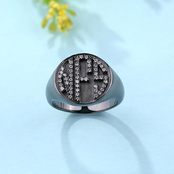 Detta distinkta personliga Circle Monogram med Cubic Zirconia har en klassisk svart plätering. De små ädelstenarna som är inlagda i cirkelmonogrammet gör ringen mer elegant totalt sett. Du kan graveras med dina initialer för att skapa en unik hyllning som du alltid håller nära. Det bästa med den här ringen är att den kan gåva till en älskad av båda könen genom att få sina initialer graverade på stycket. Lägg din beställning idag!