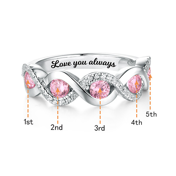 Den unika, sofistikerade designen av denna ring gör den perfekt för den romantiska, feminina kvinnan som inte skulle älska mer än en enstaka, oerstattbar smycke. Fantastiskt handgjorda i glittrande sterlingsilver. Twistbanddesignen är en konstgjord skapelse med fem hjärtformade födelsestenar du väljer. Anpassad service för denna artikel är tillgänglig, Inuti ringbandet kan du också välja att sätta söta ord upp till 15 tecken. Denna speciella gåva är perfekt för att fira en årsdag, mors dag och många andra speciella tillfällen.