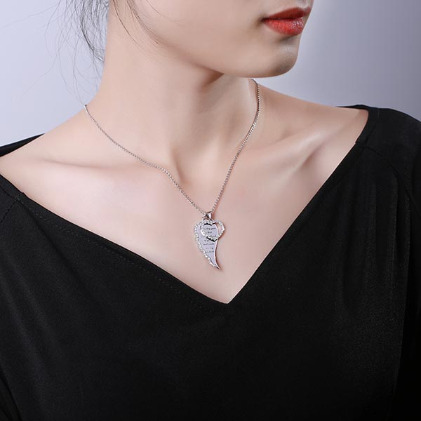 Personlig Angel Wing Heart Necklace är ett härligt minneshalsband med en silverängel-charm och hjärta. Detta utsökta fina halsband är ett lysande presentval och dess eleganta utseende kommer från fantastiskt hantverk. Låt detta underbara stycke vara en påminnelse om att din skyddsängel alltid är med dig. Anpassa det med graveringsinnehållet i dina val.