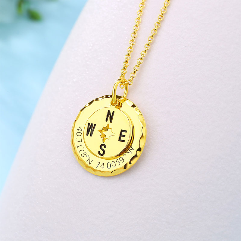 Detta delikata kompasshalsband formar en modern look med två lager skivor som gör att du sticker ut i mängden. Du kan gravera longitud och latitud eller alla bokstäver som har betydelse för dig på skivan. När du bär detta halsband kommer kompassen och koordinaterna att påminna dig om någonstans meningsfullt och peka dig i rätt riktning. En fantastisk gåva till dina nära och kära vid alla speciella tillfällen som jul, födelsedag, mors dag och alla hjärtans dag.