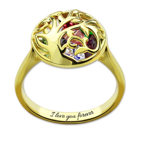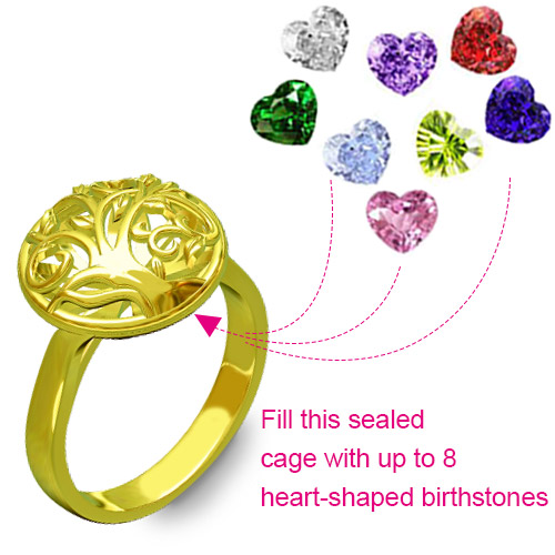 Rund bur Stamträdring med hjärtat födelsestenar guldpläterad